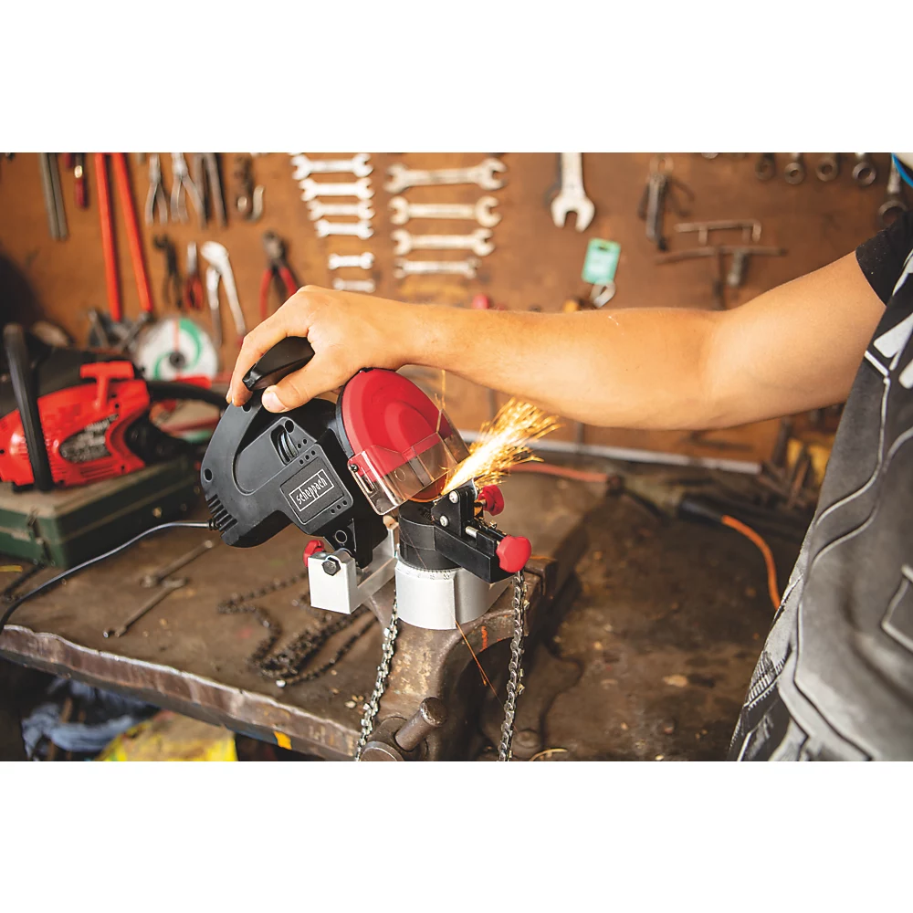 Affûteuse de chaîne puissante qui affûte rapidement et précisément. Plus sûre et plus facile que les accessoires de perçage ou les limes manuelles.